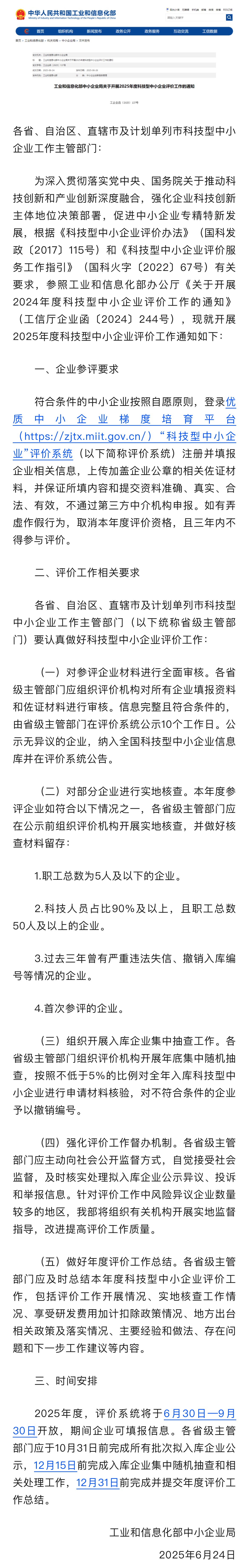 【政策導(dǎo)讀】工業(yè)和信息化部中小企業(yè)局關(guān)于開展2025年度科技型中小企業(yè)評價工作的通知